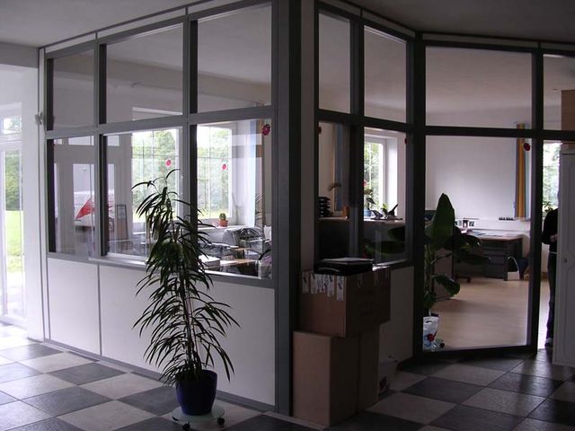 Die Wände können als Vollwand mit geschlossenen Wandschalen, mit Mittelfenstern oder Oberlichten, bis zur Glaswand in vielen Kombinationsmöglichkeiten errichtet werden. Verschiedene Türelemente, die Einrichtung mit Schiebefenstern, Sprechschaltern usw. sind praktische Details, die eine Anpassung an Ihren individuellen Bedarf erlauben.
