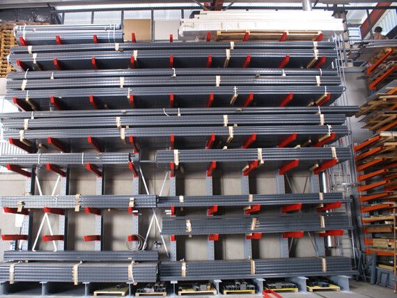 Das Allclick-Auslegerregal VS (oder Kragarmregal VS) ist für große Belastungen, wie die Lagerung von Holzplatten, Formrohren oder Stahlwaren konzipiert. Regalteile aus Formstahlprofilen und Regalstützen, die mittels Spezialankern am Boden befestigt sind, sorgen für die nötige Stabilität, um Lasten bis zu 2.000 kg pro Kragarm sicher zu lagern.
